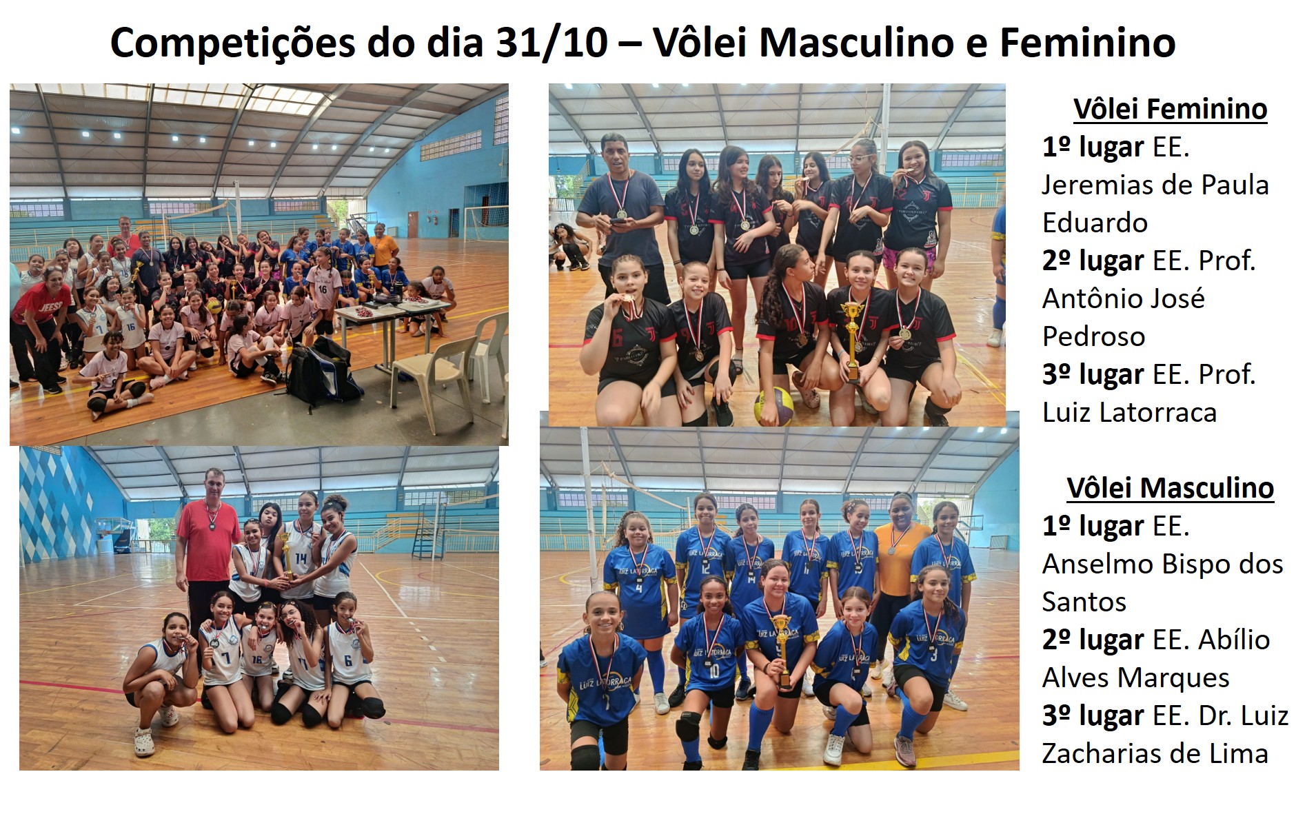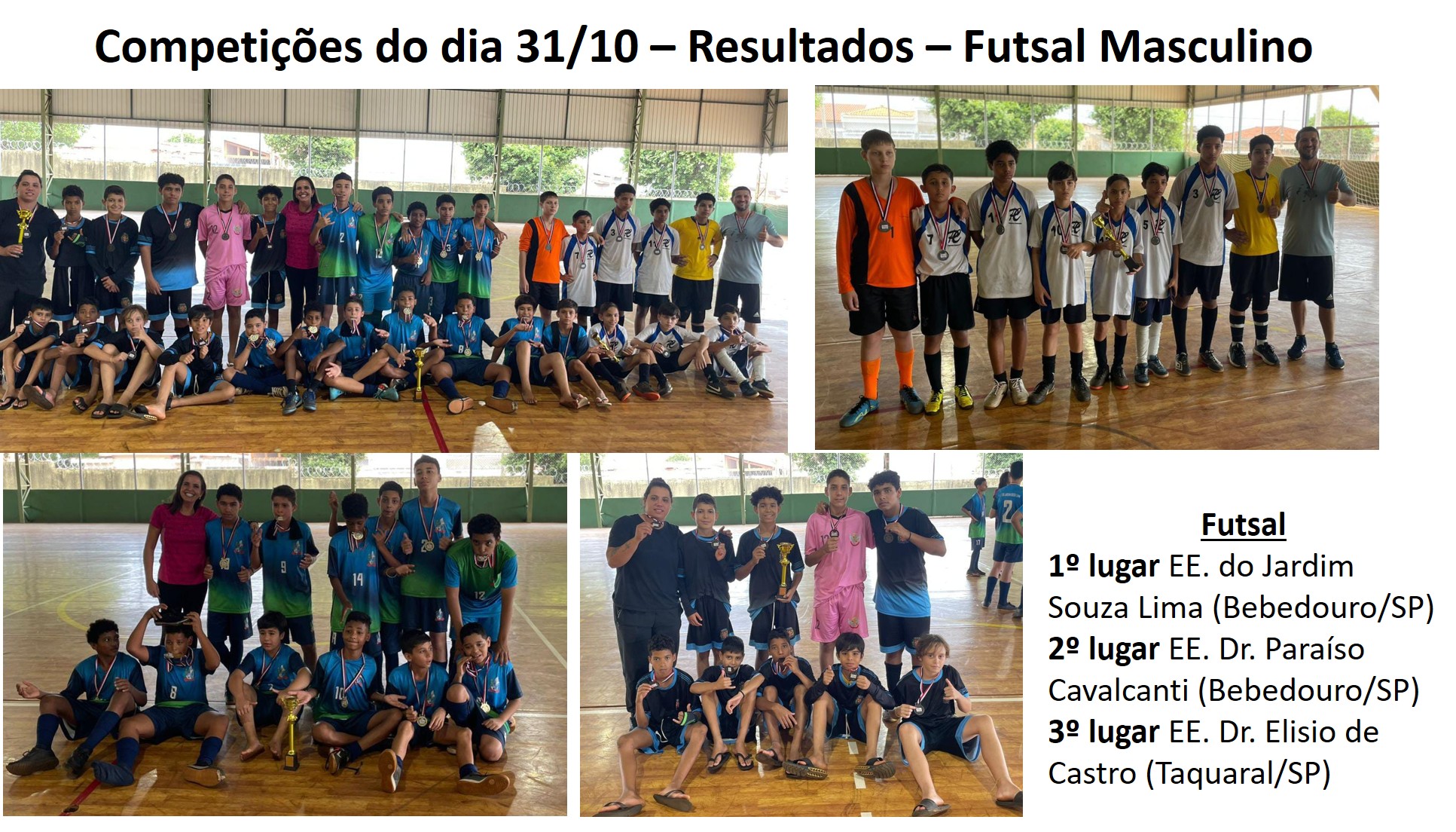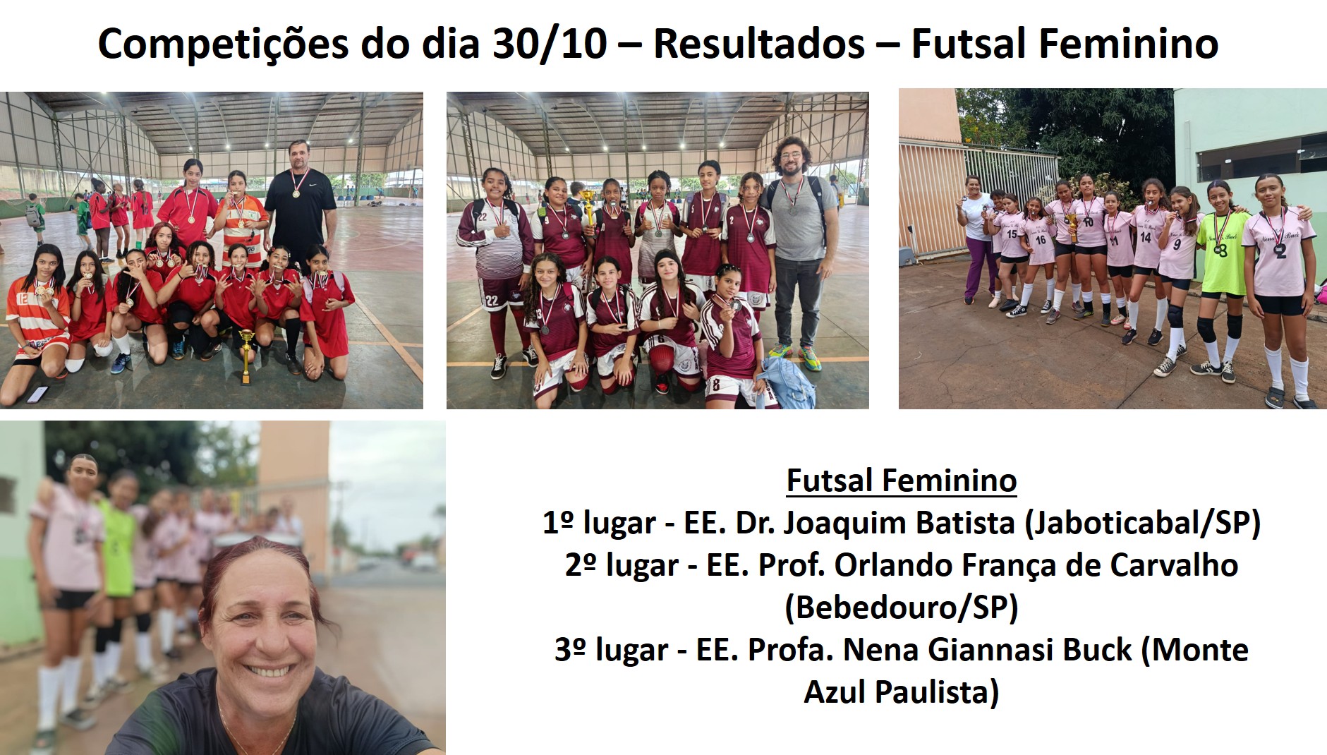Nos últimos dias 30 e 31/10, foram promovidas pela Unidade Regional de Ensino de Jaboticabal, as Finais do JEESP – Jogos Escolares do Estado de São Paulo (Categorias Pré-Mirim, modalidades de Futsal e Handebol femininos, além de Futsal e Vôlei masculinos), com as Escolas da rede estadual, no Ginásio Municipal de Esportes ‘Vereador Eduardo Atique’, em Guariba, organizado pela PEC de Linguagens – professora Karina Xavier Cruz.