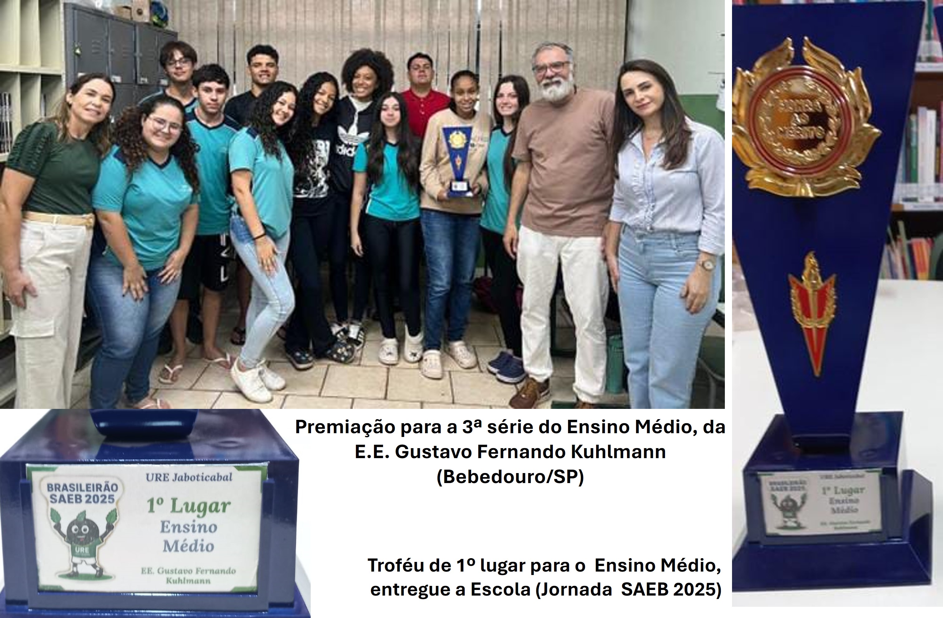 Dessa forma, no último dia 3 de novembro, a Equipe de Especialistas em Currículo da URE, representada pela Coordenadora Sueli Amaral Ramos e pelo PEC SAEB Paulo Henrique Ferraz Rosa, premiou a Unidade Escolar E.E. Gustavo Fernando Kuhlmann, que ficou em primeiro lugar no segmento Ensino Médio.
