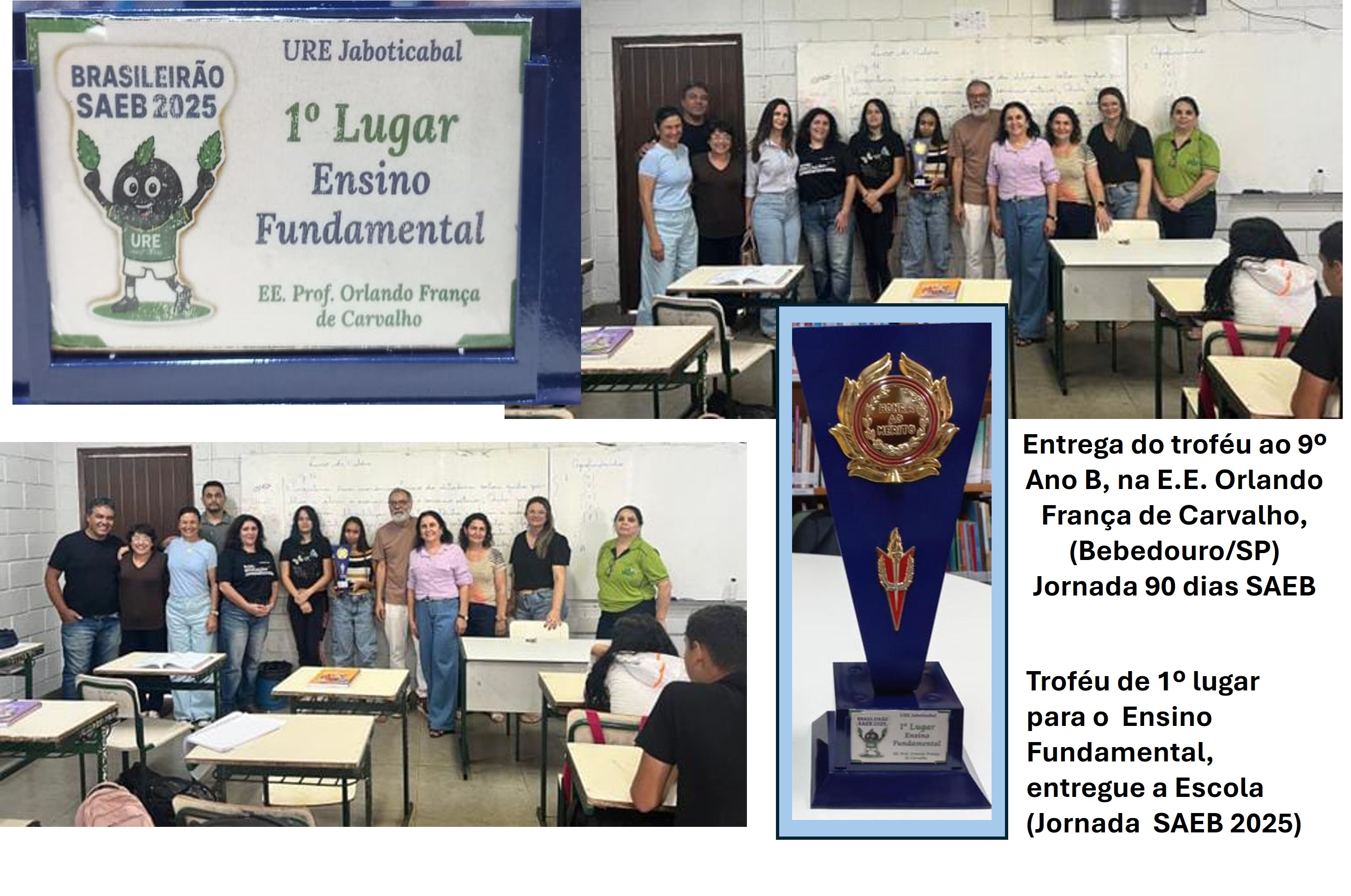 Finalizando a Jornada “90 Dias SAEB”, a Unidade Regional de Ensino de Jaboticabal realizou, entre todas as unidades escolares, uma competição segmentada entre o Ensino Fundamental e o Ensino Médio, sendo que, as unidades com maior pontuação nas seis quinzenas de tarefas durante a jornada foram premiadas.