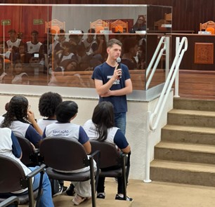 A apresentação do Programa foi conduzida pelo supervisor educacional Adriano Carlos Fernandes e pelo estudante embaixador do Programa Prontos Pro Mundo, Kauã Accorsi Mafra.