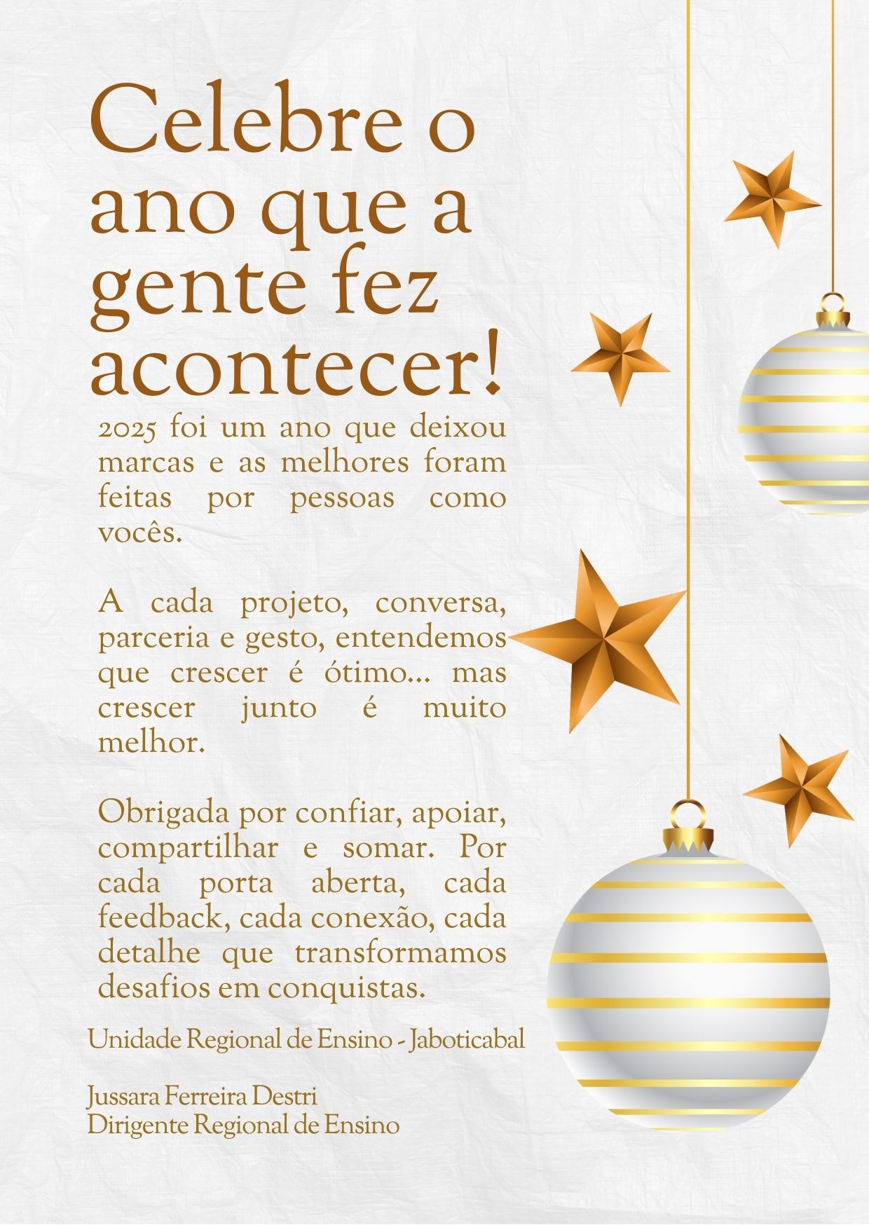 Feliz Ano Novo 2026 26-12-2526 de dezembro de 2025 LEIA TAMBÉM NOVA SESSÃO DE ATRIBUIÇÃO DE AULAS DOS ITINERÁRIOS DOS CURSOS PROFISSIONALIZANTES CONVOCAÇÃO PARA A 2ª SESSÃO DE ALOCAÇÃO DE DOCENTES NAS ESCOLAS DE PERÍODO INTEGRAL – exclusiva para docentes excedentes de 2025 CONVOCAÇÃO PARA ESCOLHA DE VAGA, CARÁTER TEMPORÁRIO, DE AGENTE DE ORGANIZAÇÃO ESCOLAR – 27/01/2026 Comunicado aos Pais