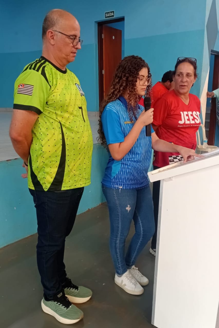 Durante a programação, a enxadrista Alícia Gerbasi (equipe da EE. Oswaldo Schiavon – Bebedouro), junto com o prof. Marcus Seixas, leu o ‘Juramento do Atleta’. O prefeito Dr. Francisco Mançano cumprimentou e agradeceu a todos, enfatizando a importância dos Jogos Estaduais na vida de cada atleta, trilhando um caminho junto à Educação.